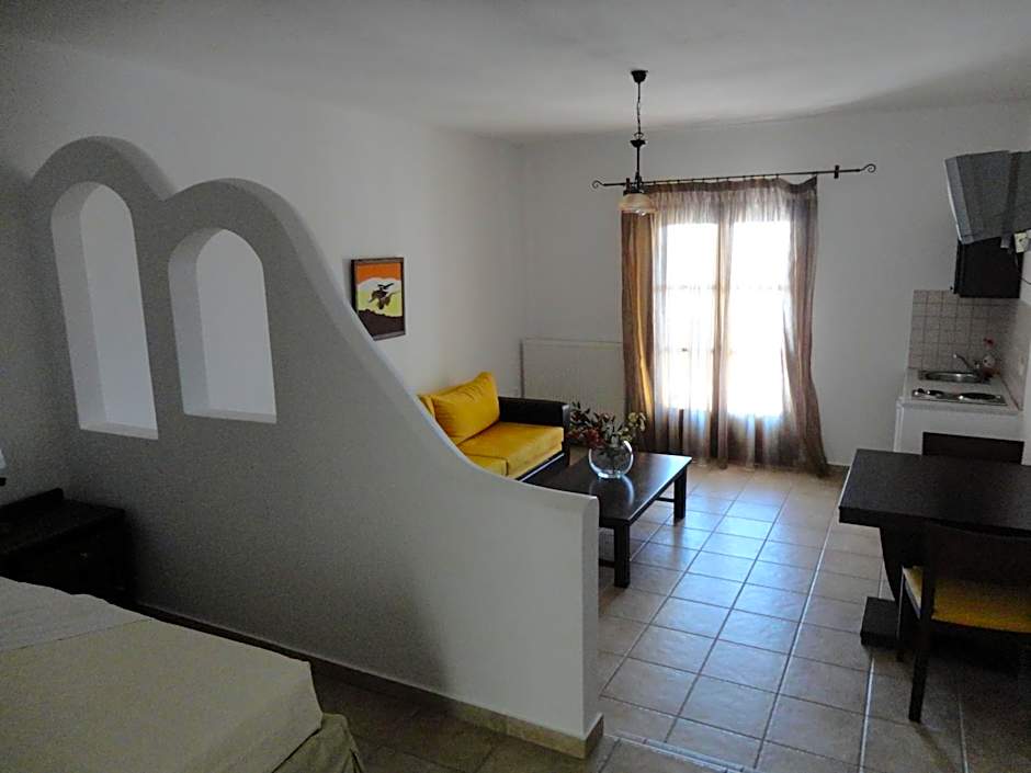 Spacious room with views to the Aegean Sea, kitchenette and dining area, seating area, TV and hairdryer.